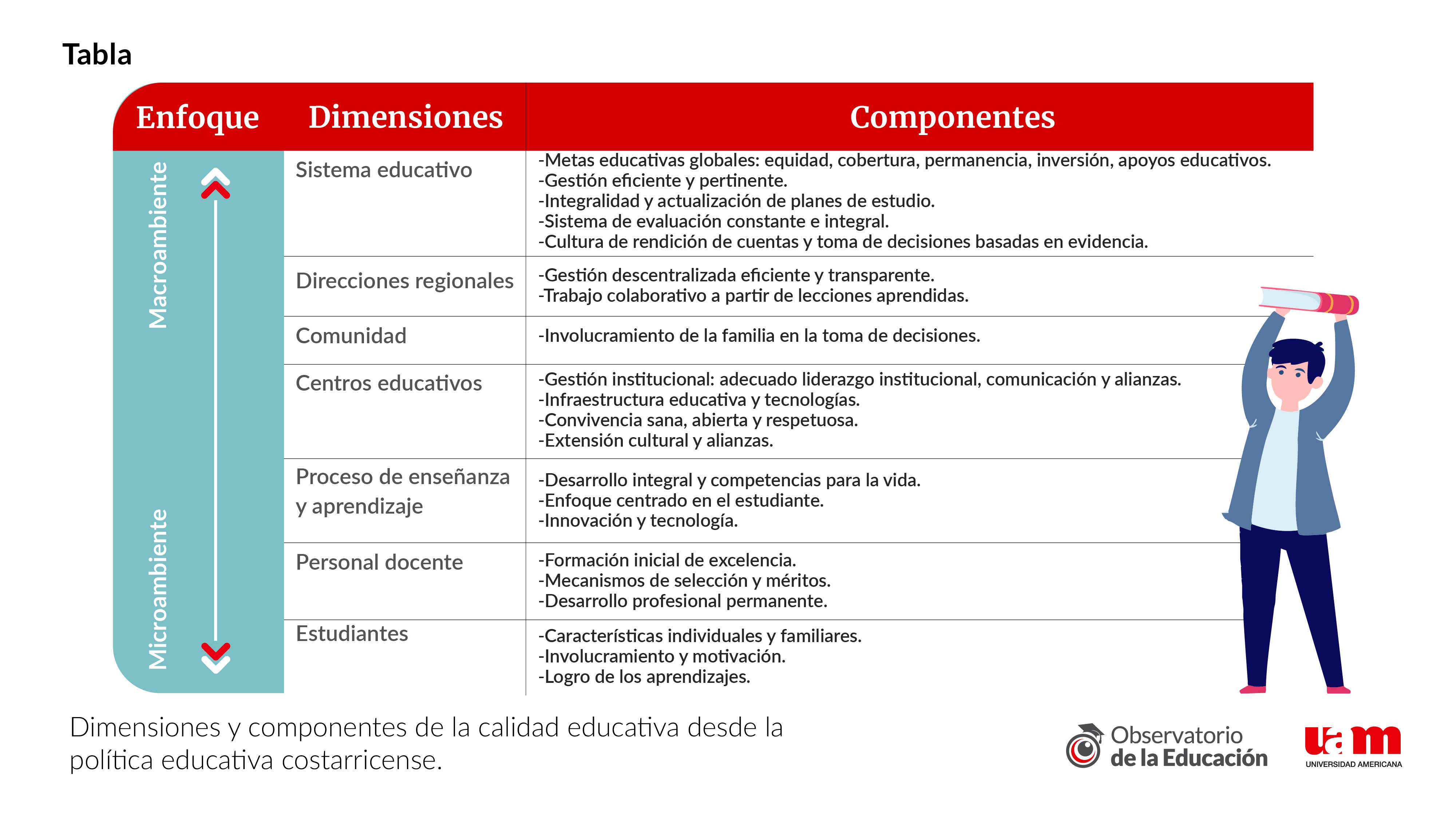El cuadro anterior, refleja que no se puede interpretar la calidad educativa sin realizar un abordaje exhaustivo que incluya los elementos necesarios para alcanzarla. De ahí que autores como Herrera-Segura & Pawlowski (2025) demuestren que las percepciones del personal docente de I y II ciclo de la Educación General Básica son fundamentales porque manifiestan una concordancia entre los lineamientos relacionados con la evaluación de tareas, asistencia y elaboración de pruebas escritas en función de aquellos indicadores de aprendizaje que se plantean en el contexto nacional.